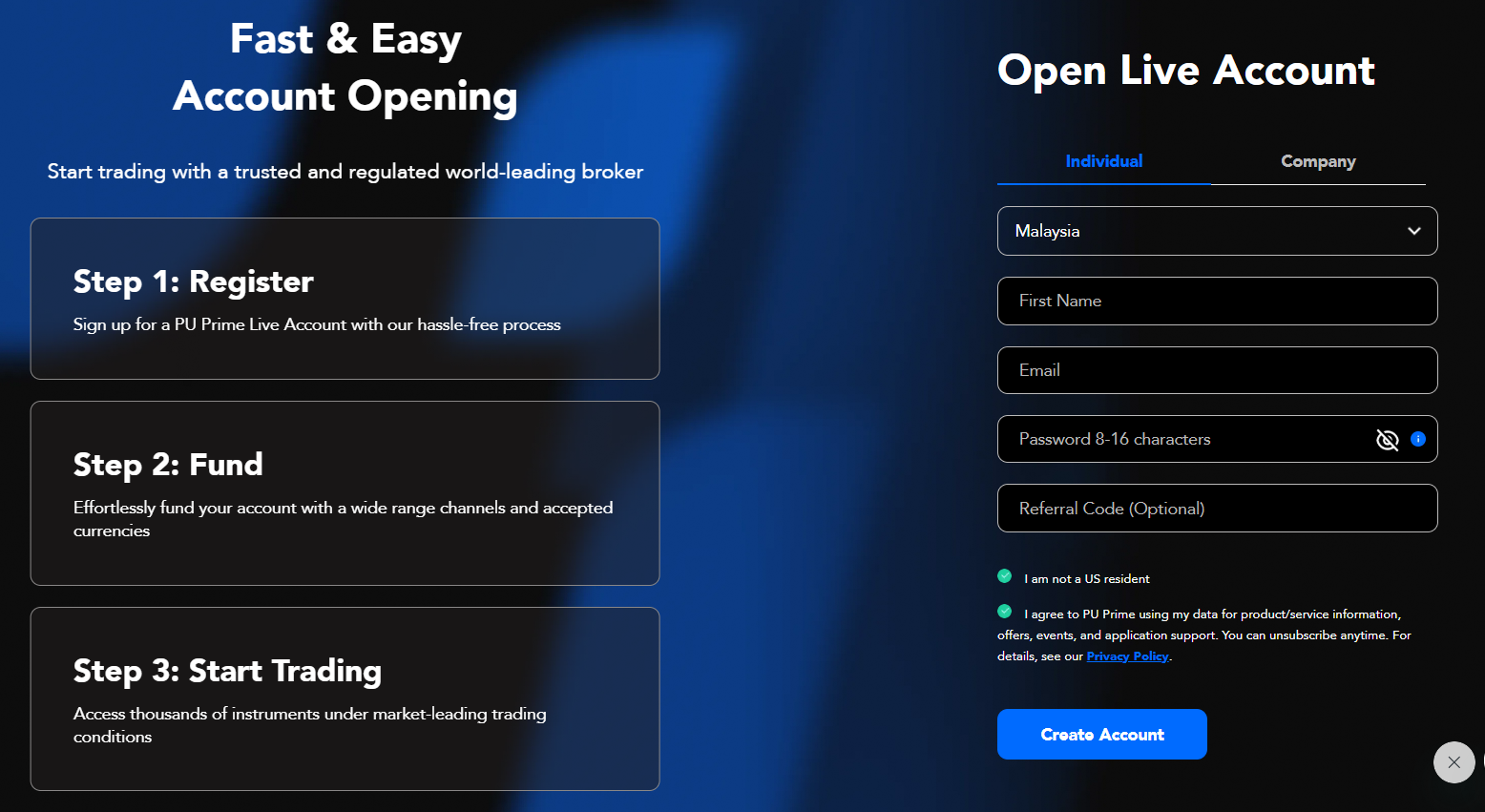 *Bitte stellen Sie sicher, dass Sie kein Einwohner der Vereinigten Staaten, Singapurs, Australiens oder Chinas sind, da PU Prime keine Kunden aus diesen Ländern akzeptiert. - Füllen Sie Ihre Bewerberdaten aus und klicken Sie auf „Weiter“.