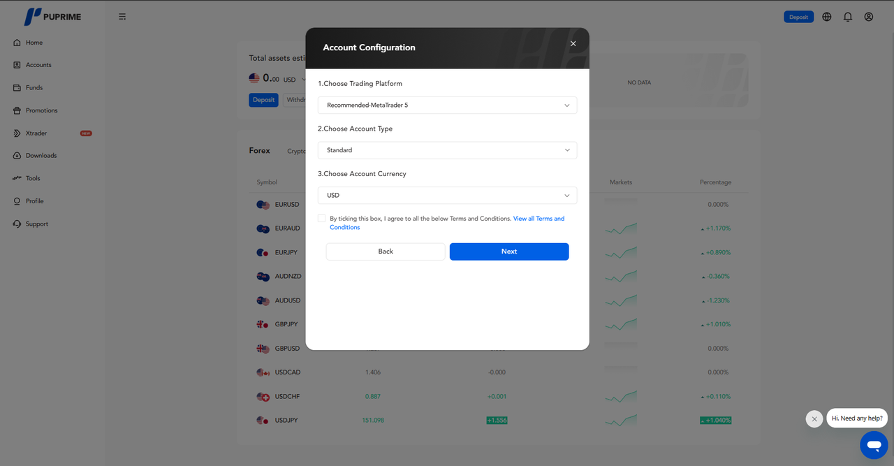- Im Abschnitt "Kontokonfiguration" wählen Sie die gewünschte Handelsplattform, den Kontotyp und die Kontowährung aus. Lesen Sie die Allgemeinen Geschäftsbedingungen sorgfältig durch, markieren Sie das Kästchen, um zuzustimmen, und klicken Sie auf die Schaltfläche "Weiter", um fortzufahren.