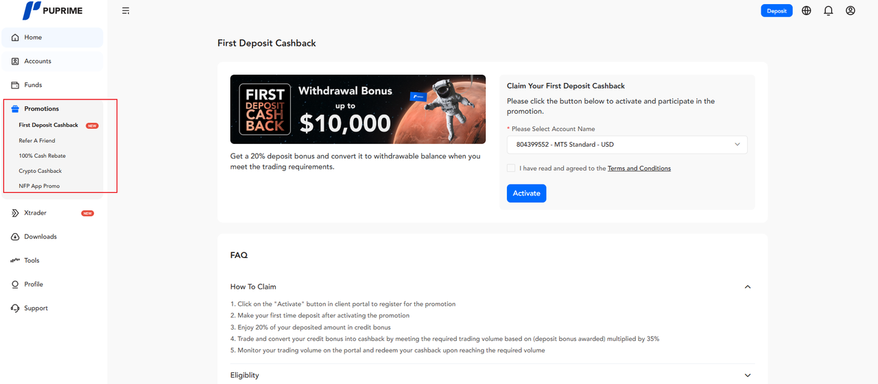 Nachdem sich der Kunde im Kundenportal angemeldet hat, kann er im Dashboard-Menü "PROMOTION" auswählen und die gewünschte Promotion auswählen. Für eine detaillierte Erklärung einer bestimmten Promotion besuchen Sie bitte unser Help Center unter https://helpcenter.puprime.com/hc/en-001, wählen Sie den Tab "Promotions" und wählen Sie die bevorzugte Promotion aus.