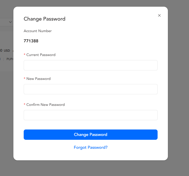 ii)Um das Passwort für Ihr Demo-Konto zu ändern, loggen Sie sich in Ihr Kundenportal ein, navigieren Sie zu "Konto", wählen Sie Ihr Demo-Konto aus und klicken Sie auf die Schaltfläche im Abschnitt "Passwort ändern". Geben Sie dann Ihr aktuelles Passwort gefolgt von Ihrem neuen Passwort ein.