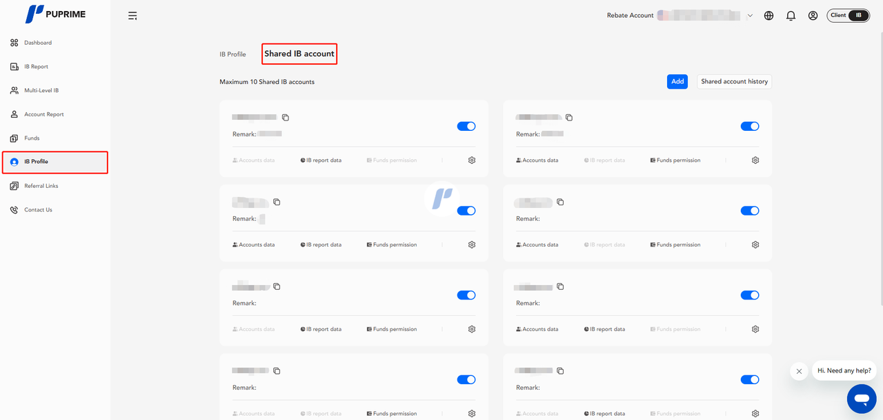 IB report data: View IB data pages (Dashboard, Multi-Level IB - Account). The data will be hidden if permission is not allowed.