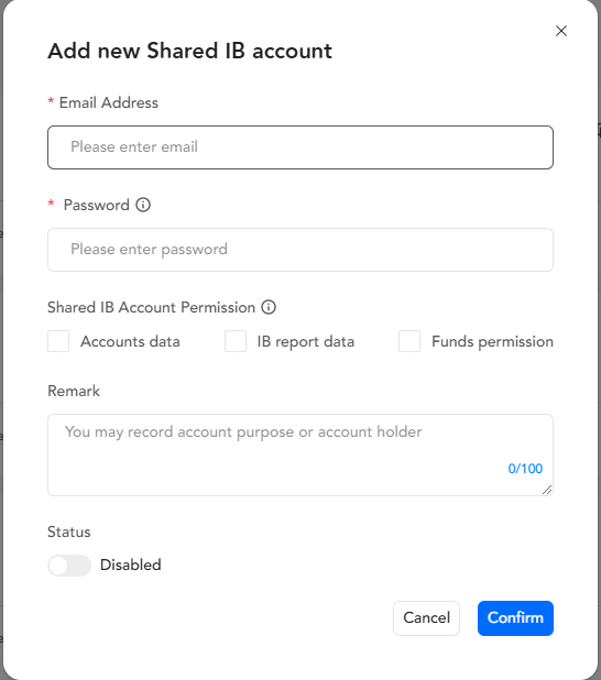 Introducing Broker can choose whether to share their account data, IB report data and funds permissions. Toggle "Enabled" to activate sharing, then click "Confirm".