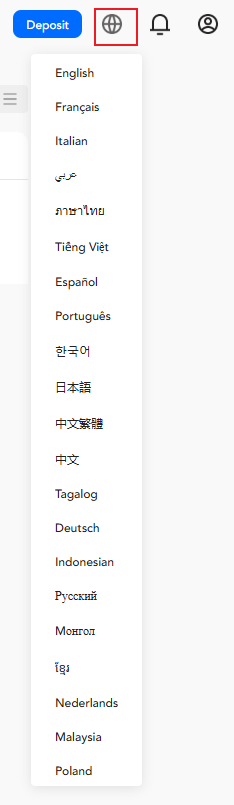 Matapos mag-log in sa Client Portal, maaaring piliin ng kliyente ang pindutang ito sa itaas na kanang sulok ng pahina at piliin ang iyong ginustong wika.