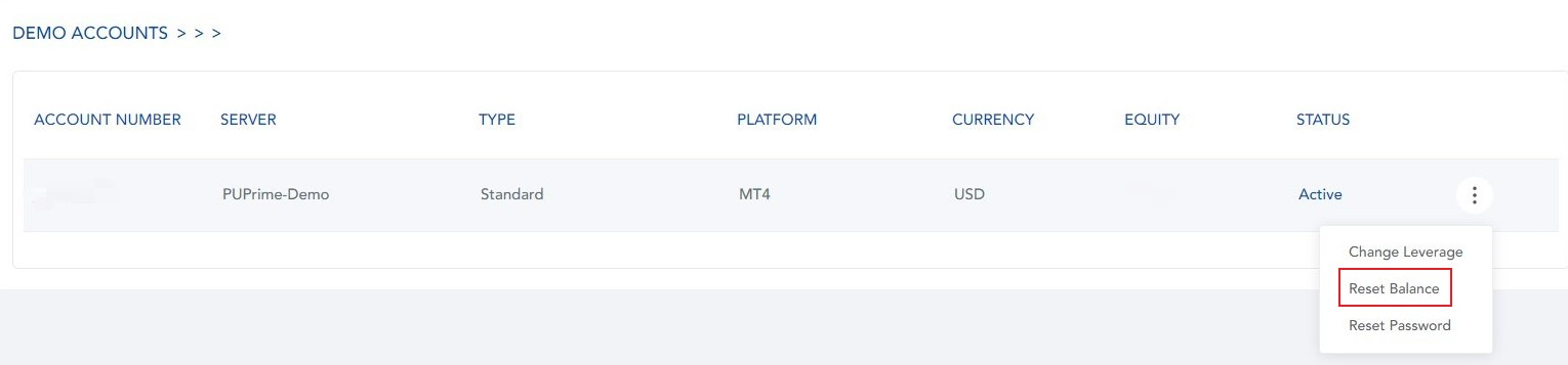 Maaaring mag-login ang kliyente sa Client Portal at piliin ang "DEMO ACCOUNT" mula sa dashboard menu. Kinakailangan ng kliyente na i-click ang icon ng reset balance upang i-reset ang balanse ng demo account.