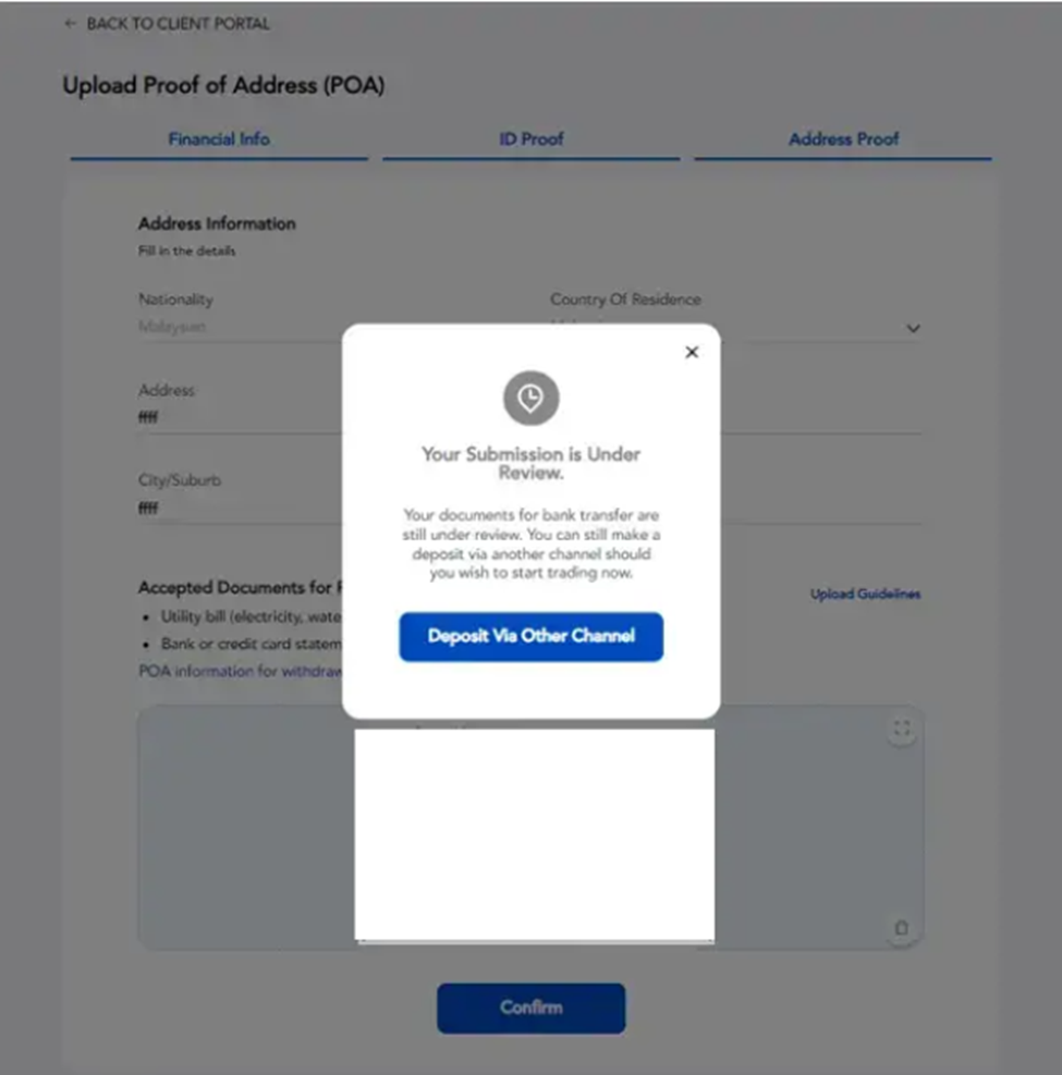 Kasunod nito, punan ang kinakailangang detalye ng pananalapi at magbigay ng patunay ng tirahan (na inisyu sa loob ng huling tatlong buwan) at ang iyong Identification card/passport para sa pagpapatunay bago magpatuloy sa deposito ng International Bank Wire Transfer.