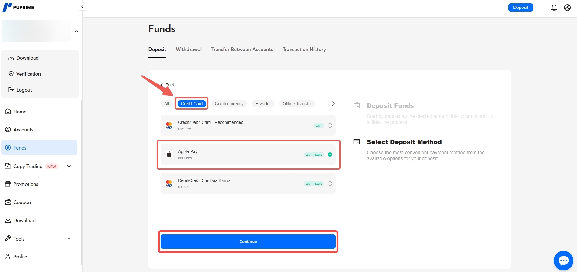 2. "Deposit" पर क्लिक करें, वह ट्रेडिंग खाता चुनें जिसे आप फंड करना चाहते हैं, जमा राशि दर्ज करें, और "Continue" पर क्लिक करें।