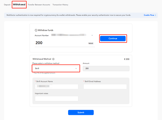 Pilih E-wallet yang sesuai (Skrill/Neteller/Bitwallet/Sticpay/Astropay/Perfect Money/AirTM) pada bagian bawah "Withdrawal Method" dan klik "Submit".