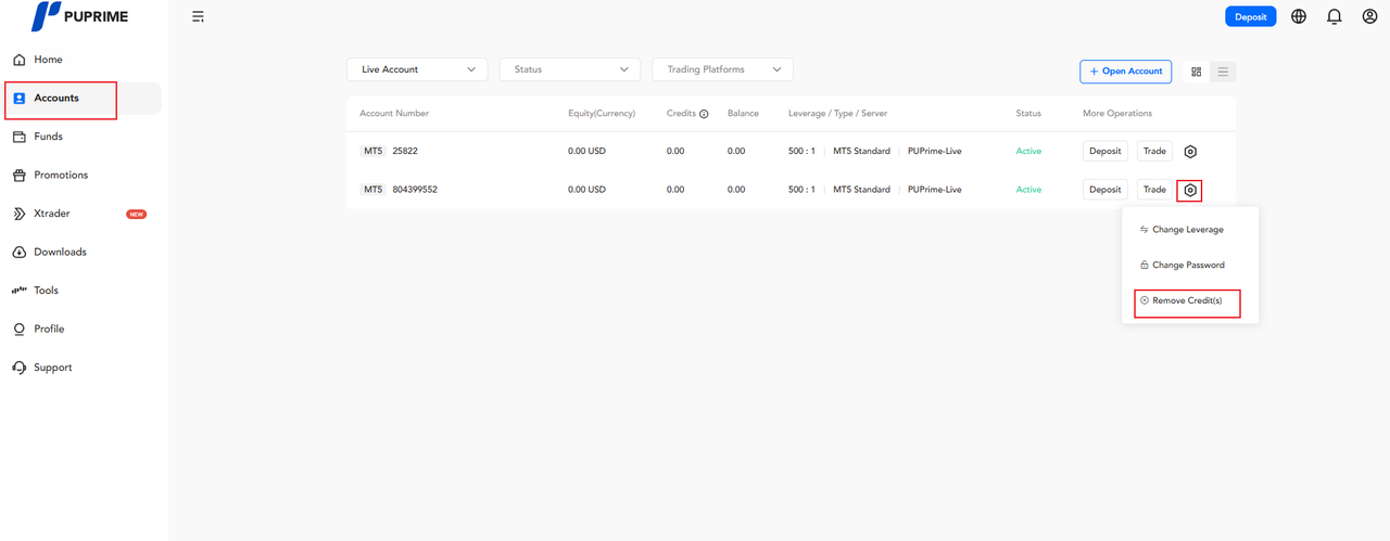 Gli account con un bonus di credito non possono effettuare trasferimenti interni.Per rimuovere il credito, il cliente dovrebbe cliccare sull'opzione "Accounts" dal menu della dashboard, quindi selezionare il pulsante