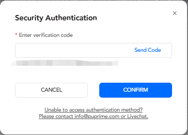 セキュリティのため、認証アプリケーションを開いて提供されたコードを入力してください。認証アプリケーションを設定するには、このリンクをクリックしてください:https://helpcenter.puprime.com/hc/en-001/articles/9222563828111-How-to-modify-security-authenticator-application