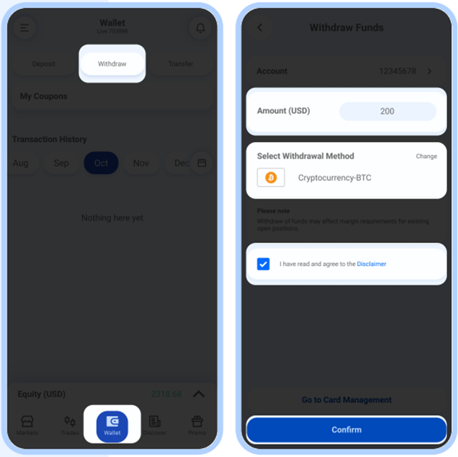 引き出したい金額を入力し、引き出し方法を選択してから、Disclaimerに同意してください。'Confirm'をクリックして続けてください。