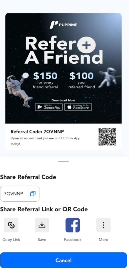 Help Center | PU Prime | More Than Trading PU Prime App Pertanyaan Aplikasi PU Prime Bagaimana untuk merujuk seorang rakan? 1. Ketik pada butang "Profile". 2. Ketik pada butang "Referrals". 3. Ketik "Invite Friends Now". 4. Salin dan kongsi kod rujukan atau kod QR anda.