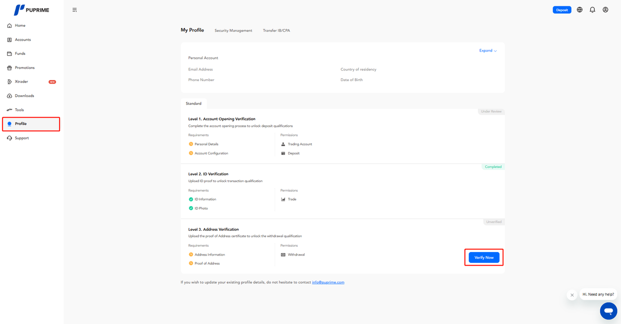 Po pomyślnym przejściu weryfikacji tożsamości, możesz kliknąć zakładkę "Profile" i kliknąć "Verify Now".