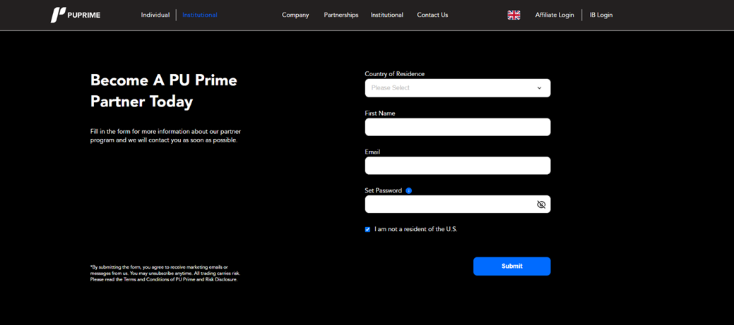 Proszę wejść na stronę rejestracyjną PU Prime poprzez https://www.puprimepartners.com/ib-registration/ i wypełnić wymagane informacje.