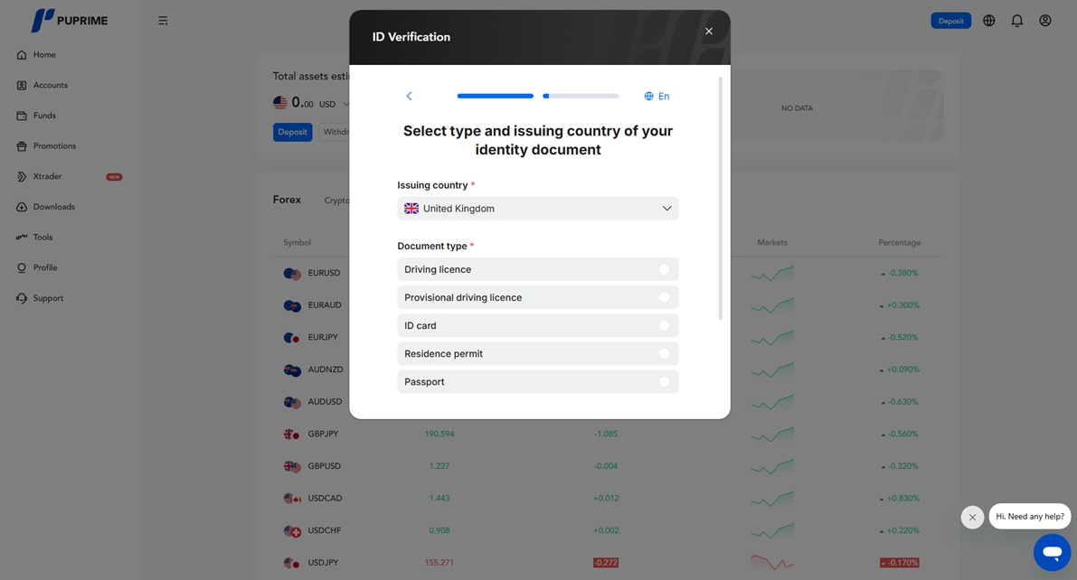 Następnie zostaniesz poproszony o potwierdzenie kraju zamieszkania. *Prosimy upewnić się, że nie jesteś rezydentem Stanów Zjednoczonych, Singapuru, Australii ani Chin, ponieważ PU Prime nie akceptuje klientów z tych krajów.
