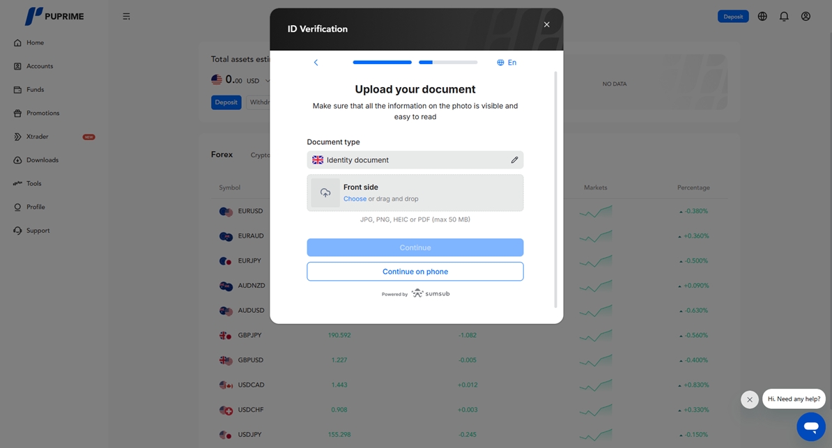 W sekcji „Załaduj swój dokument” załaduj przód swojego dokumentu tożsamości i kliknij „Kontynuuj”.