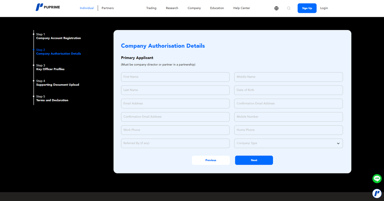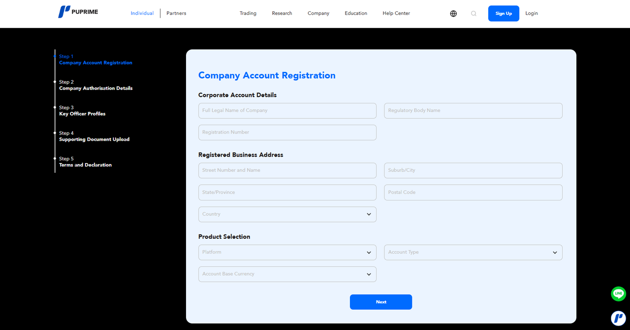 Jeśli chcesz założyć konto firmowe, wejdź na stronę rejestracji PU Prime poprzez https://www.puprime.com/forex-trading-account/ i wybierz "Company Account".
