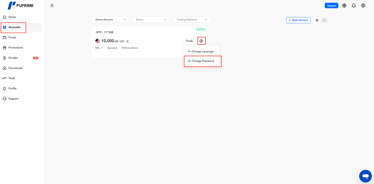 ii)Aby zmienić hasło do swojego konta demo, zaloguj się do swojego portalu klienta, przejdź do sekcji "Konto", wybierz swoje konto Demo i kliknij przycisk w sekcji "Zmiana hasła". Następnie wprowadź swoje obecne hasło, a potem nowe hasło.