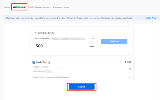 Zaloguj się do swojego Portalu Klienta - kliknij "Funds" - wybierz "Withdrawal" i wprowadź "Withdrawal Amount", który chcesz wypłacić, a następnie kliknij przycisk "Continue".