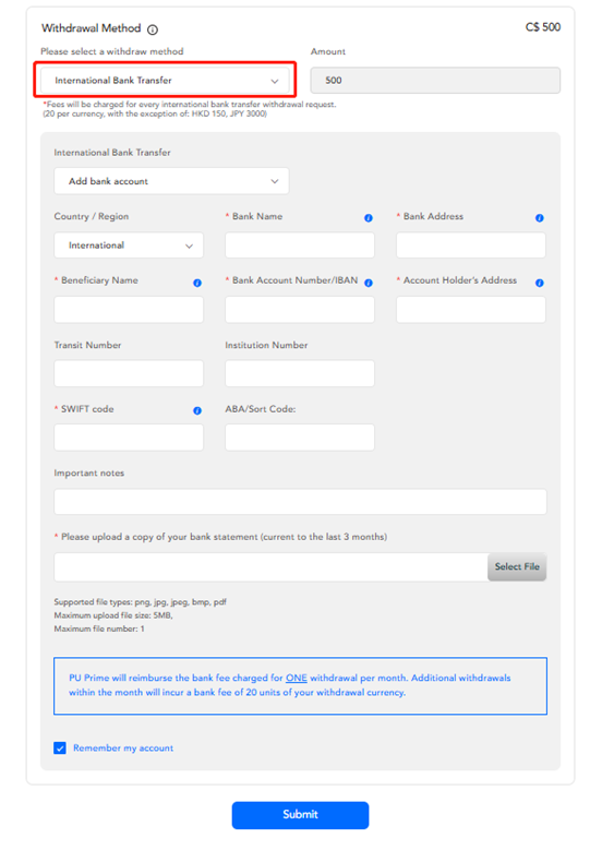 Escolha a opção correspondente "Transferência Bancária Internacional" na seção inferior de "Método de Retirada", preencha o formulário abaixo e clique em "Enviar".