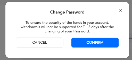 帮助中心 | PU Prime | More Than Trading 账户管理 客户门户 如何在客户专区中更改密码? 登录客户专区后,导航至页面右上角,选择“验证”并选择“安全管理”。 为确保您账户中资金的安全,更改密码后的T+3天内不支持提款。选择“确认”以继续更改密码。 客户需要输入当前密码,并根据密码要求设置新密码。选择“确认”以完成密码更改。