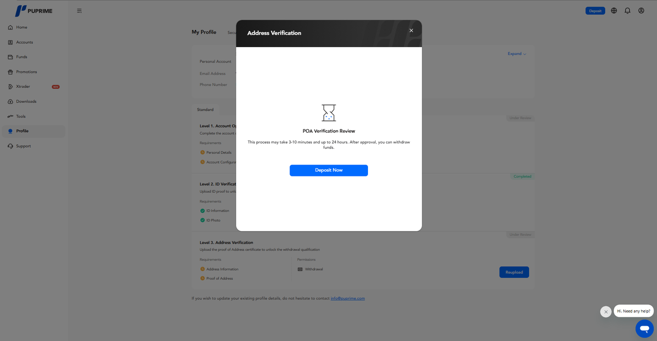 - 客户随后将被重定向到“地址验证”页面,以通过填写地址详情并上传地址证明来完成3级注册流程,然后点击“提交”。必填字段标有星号(*)。