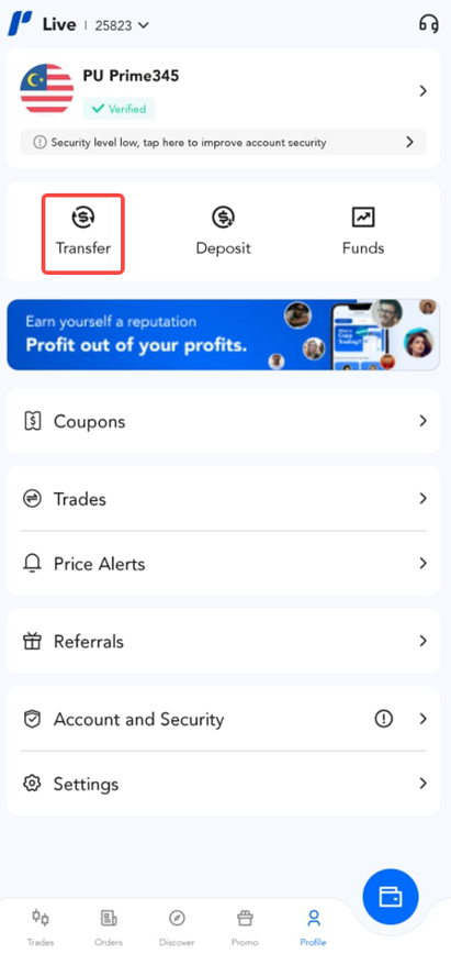 帮助中心 | PU Prime | More Than Trading PU Prime App PU Prime APP 咨询 如何进行资金转账? 1. 点击“Profile”按钮。 2. 点击“Transfer”按钮。 3. 输入资金转账详情,然后点击“下一步”继续进行资金转账。