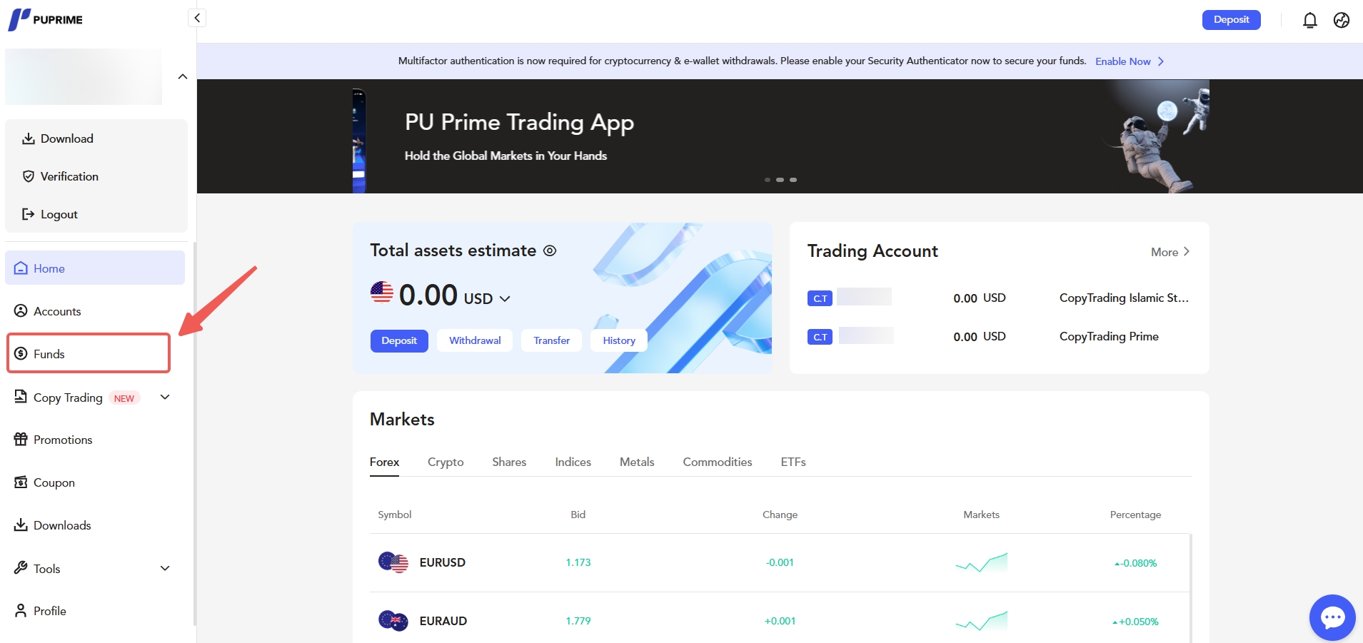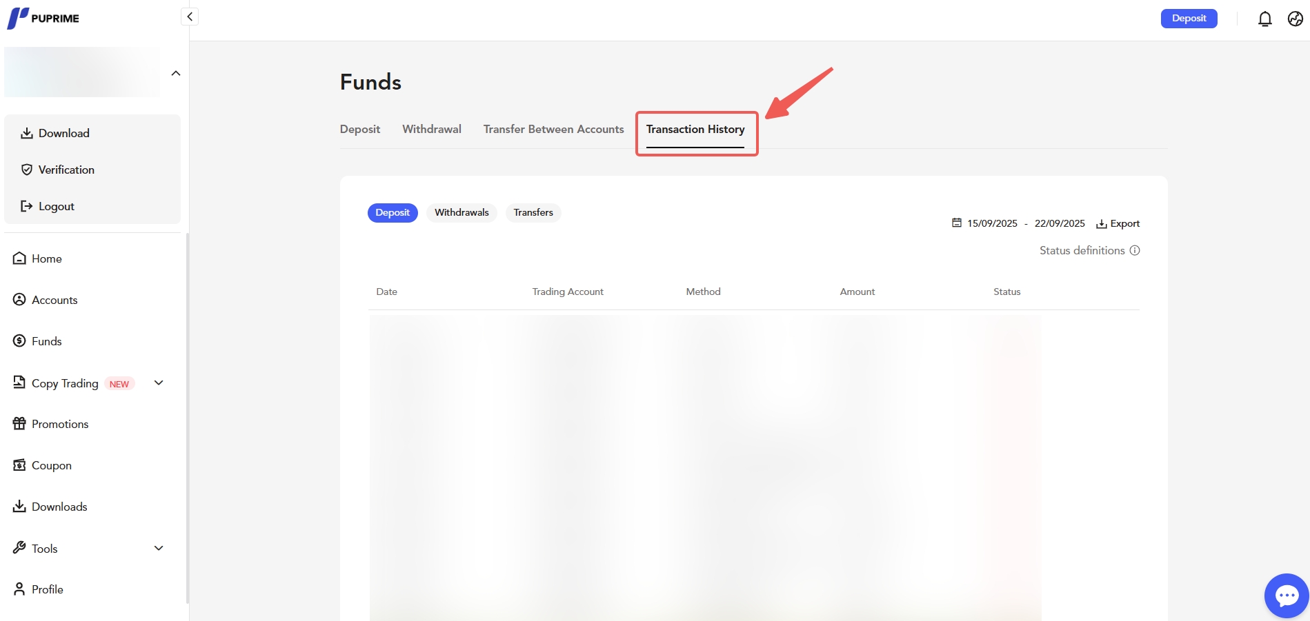 帮助中心 | PU Prime | More Than Trading 存款和提款 提款 我如何查看我的提款状态? 您可以通过PU Prime客户门户或PU Prime应用轻松跟踪您的提款请求状态。 查看提款状态的方法: 1. 登录您的客户门户或打开PU Prime应用。 2. 进入“资金”部分。 3. 选择“交易历史”。 4. 选择“提款”标签以查看您的提款状态。 在那里,您将能够查看提款的详细信息和当前状态,无论是处理中、已完成还是需要进一步操作。 如果您需要额外帮助,请通过在线聊天联系PU Prime支持,或使用您的注册邮箱发送电子邮件至info@puprime.com。